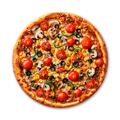 Base de salsa de tomate y queso mozzarella, con tomate cherry, pimentón, choclo, aceitunas y champiñones frescos. Colorida, sabrosa y 100% veggie.